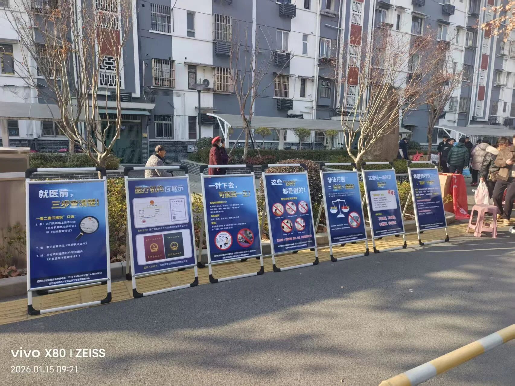 为进一步强化医疗卫生行业监管,净化医疗服务市场环境,切实保障人民群众健康权益,1月15日上午,经开区社会保障和卫生健康局牵头组织区公卫中心、戚墅堰街道社会事务办公室及街道社区卫生服务中心,在戚墅堰东方社区联合举办“打击非法行医、非法医美”主题宣传活动。本次活动秉持“人人参与、人人尽责”的共治理念,通过“培训赋能、互动宣教、健康服务、政策咨询”多维融合模式,推动医疗安全知识深入基层、贴近群众。