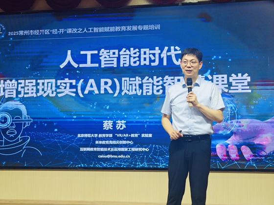 本次讲座特邀北京师范大学教育学部副教授、博导——蔡苏,担任主讲嘉宾。讲座以"人工智能时代增强现实(AR)赋能智慧课堂"为主题,蔡教授深入浅出地阐述了科技发展日新月异背景下,人工智能(AI)、虚拟现实/增强现实(VR/AR)等新技术在教育领域的应用前景。他指出,虚实融合AR学习环境与生成式人工智能(AIGC)的整合正在催生新的教学模式,为课堂教学提质增效注入新动能。讲座不仅介绍了国内外教育领域中AR学习环境的现状和发展趋势,还分享了自主研发落地实践的课堂AR+AIGC教学案例,为与会教师提供了宝贵的实践参考。