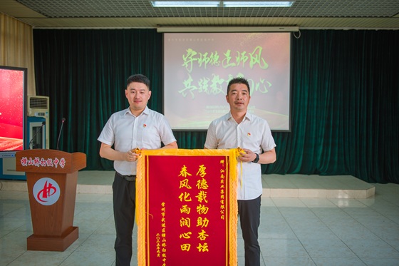 典礼在庄严的国歌声中拉开帷幕。徐建文校长回顾一年来学校在教育教学中取得的扎实进展,并对全体教师的默默耕耘表示充分肯定。他强调,这些成绩的取得,离不开一支敬业、专业的师资队伍和精细的学校管理,更离不开社会各界的支持与帮助。江南实业集团有限公司副总经理陈皓先生在致辞中表达将对横初教育事业持续关注与支持,并代表江南集团向全校教师致以崇高的敬意。他表示,教育是国之根本,江南集团愿与学校携手,共同助力地方教育事业的蓬勃发展。陈皓先生与横山桥初中领导班子为获奖教师佩戴绶带并颁发奖金。典礼尾声,徐建文校长代表学校向陈皓先生赠送锦旗,再次表达对江南实业集团有限公司衷心的感谢。