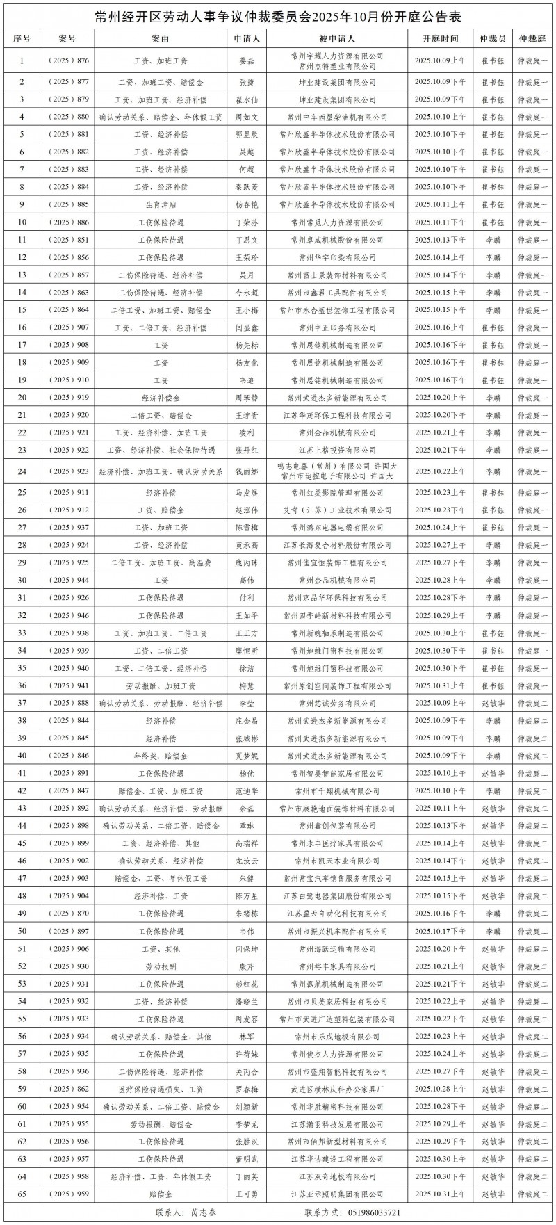 信息名称:常州经开区劳动人事争议仲裁委员会2025年10月份开庭公告表