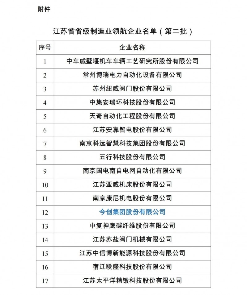 近日,江苏省工信厅公示了省级制造业领航企业名单(第二批),全省仅55家制造业企业入选。今创集团股份有限公司(股票代码:603680)凭借先进的制造水平、技术创新能力等卓越的综合实力,成功入选该榜单,彰显了集团在制造业领域的领先地位。