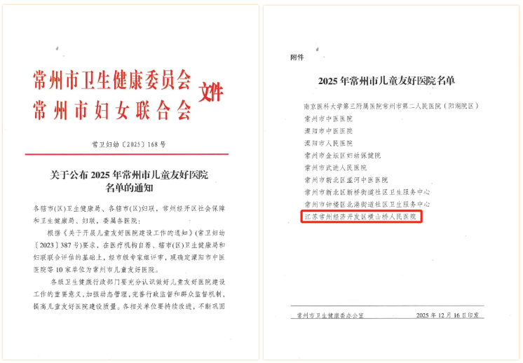 近日,常州市卫生健康委员会、常州市妇女联合会联合印发《关于公布2025年常州市儿童友好医院名单的通知》,横山桥人民医院成功获评“常州市儿童友好医院”,成为经开区第二家市儿童友好医院,为区域儿童健康事业发展注入新活力。