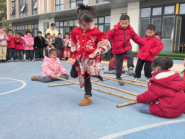 文化展示环节精彩纷呈。中班幼儿演绎灵动的新疆舞,小班萌娃摇起喜庆的荡湖船,大班孩子敲响富有节奏感的民族打击乐,充分展现民族文化多样性与幼儿艺术表现力。民俗游戏区同样热闹非凡。投壶竞技考验专注与手眼协调,跳竹竿舞则需同伴默契配合,在协作中孩子们自然体会到“团结合作”的乐趣与意义。