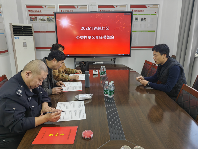 为进一步规范公益性墓区管理,深化殡葬改革,守护生态环境与群众殡葬权益,近日,横山桥镇西崦社区组织举行公益性墓区管理责任书签订仪式,社区负责人与公墓管理负责人现场签约,明确双方职责边界,筑牢墓区管理责任防线。社区相关工作人员、居民代表列席见证。