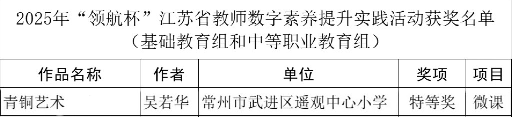 近日,由省教育厅主办的2025年“领航杯”江苏省教师数字素养提升实践活动比赛结果公布,遥观中心小学年轻教师吴若华荣获特等奖。